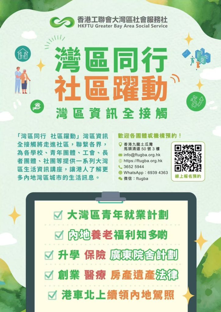 「灣區同行 社區躍動」灣區資訊全接觸是一系列大灣區生活資訊講座,為各學校、青年團體、工會、長者團體、社團等提供灣區資訊,讓港人了解更多內地灣區城市的生活訊息。