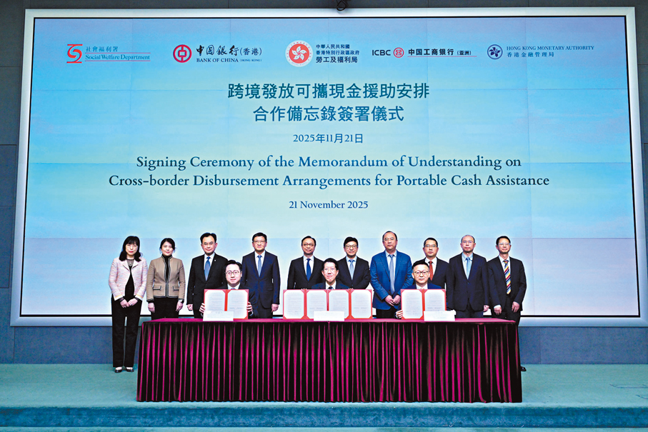 香港特區政府社會福利署與中銀香港和中國工商銀行(亞洲)11月21日簽署合作備忘錄,於2026年中推展跨境發放可攜現金援助安排。