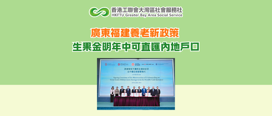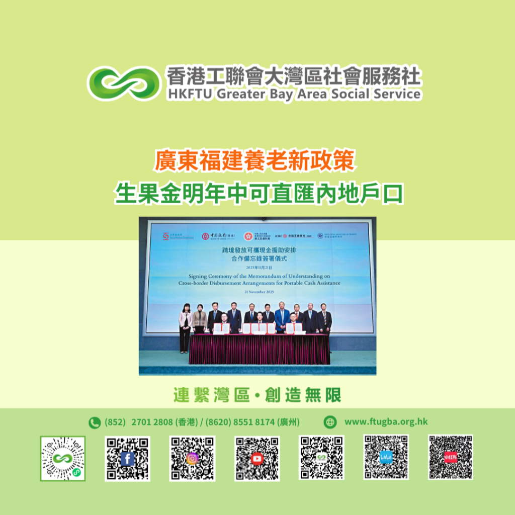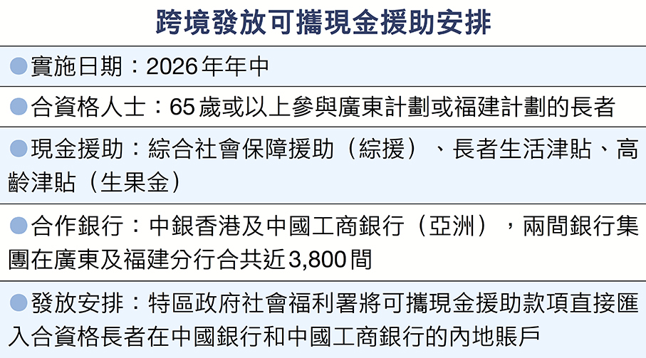 社署與中銀香港及中國工商銀行(亞洲)機構簽署有關合作備忘錄,2026年中合作推出跨境發放可攜現金援助服務,特區政府的援助金可直接匯到合資格長者在內地的戶口,省卻由香港銀行戶口匯款到內地的程序,有關直接匯款服務並免除收費。