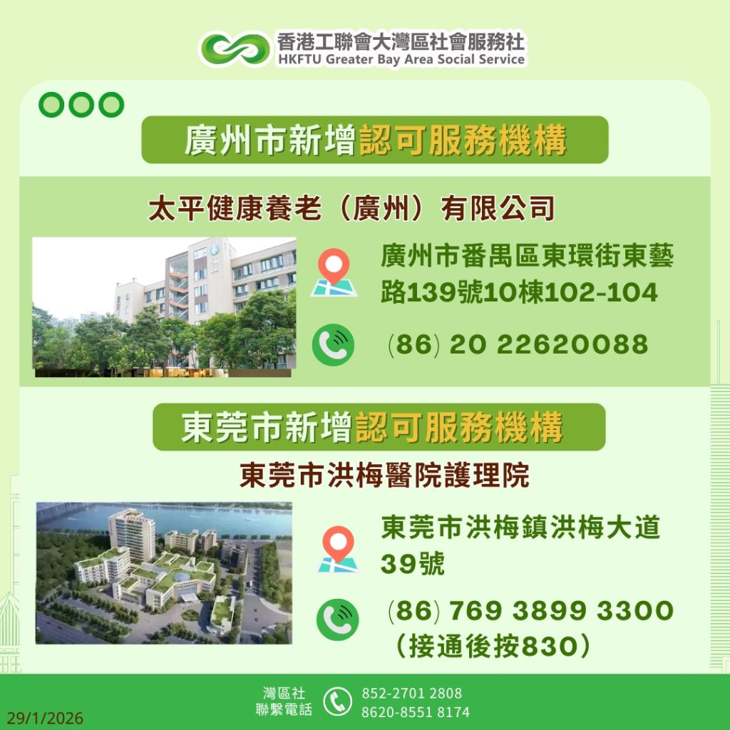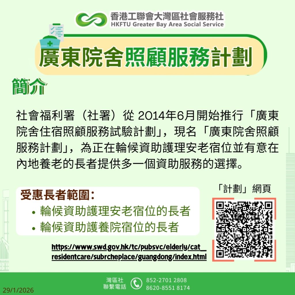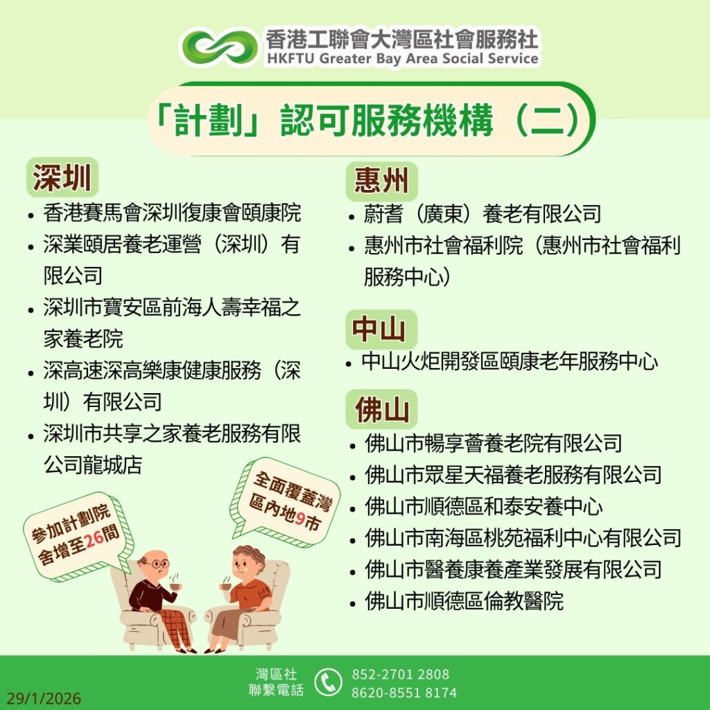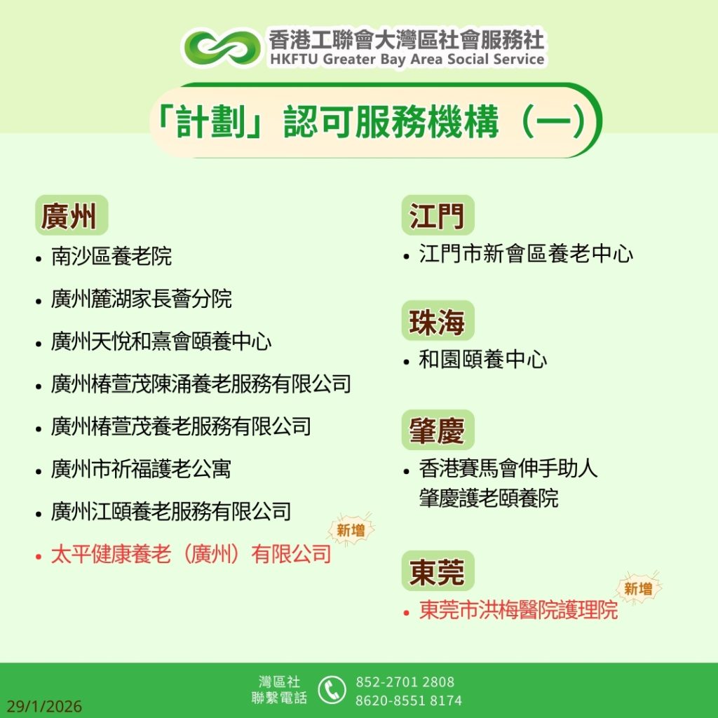 早前香港社會福利署宣布,廣東院舍照顧服務計劃從2月1日起新增兩家分別位於廣州和東莞的安老院為認可服務機構,即共有26家安老院舍參與計劃,全面覆蓋9個粵港澳大灣區內地城市。