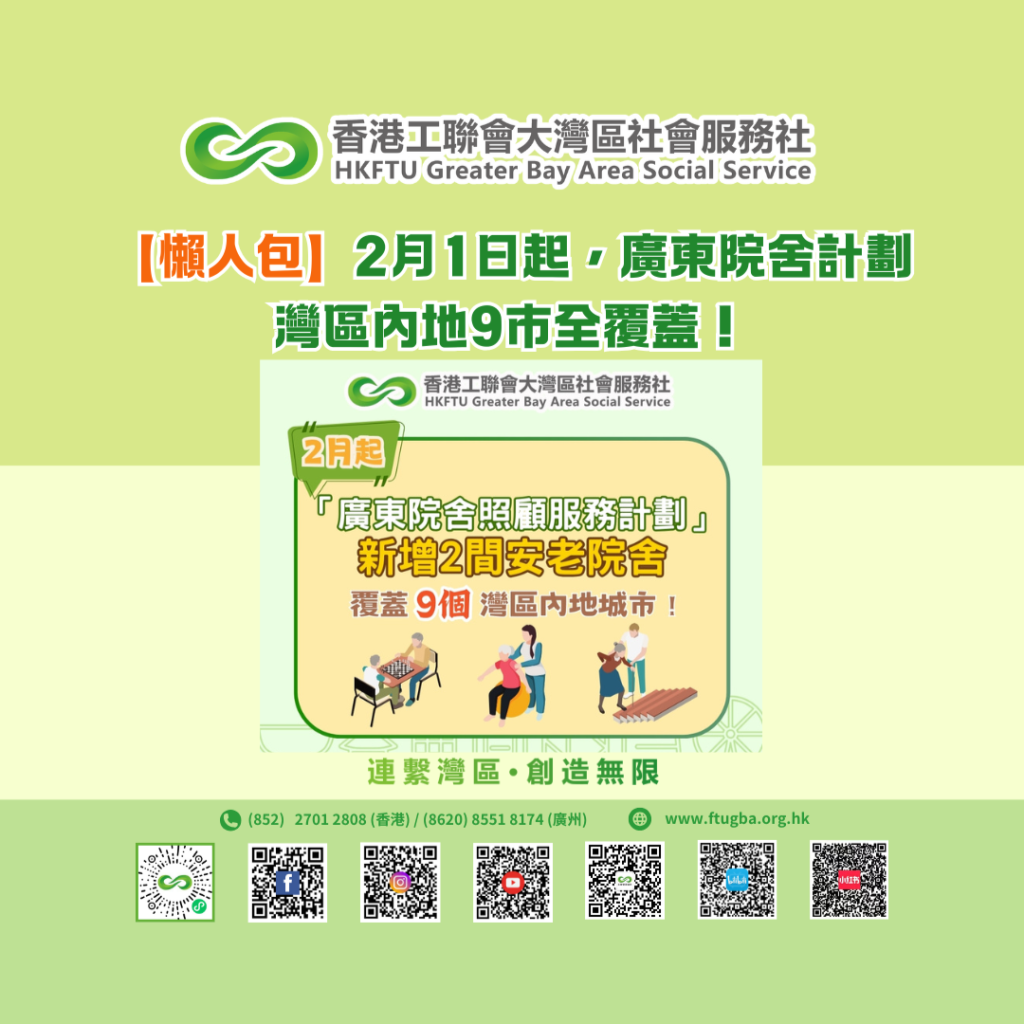 早前香港社會福利署宣布,廣東院舍照顧服務計劃從2月1日起新增兩家分別位於廣州和東莞的安老院為認可服務機構,即共有26家安老院舍參與計劃,全面覆蓋9個粵港澳大灣區內地城市。