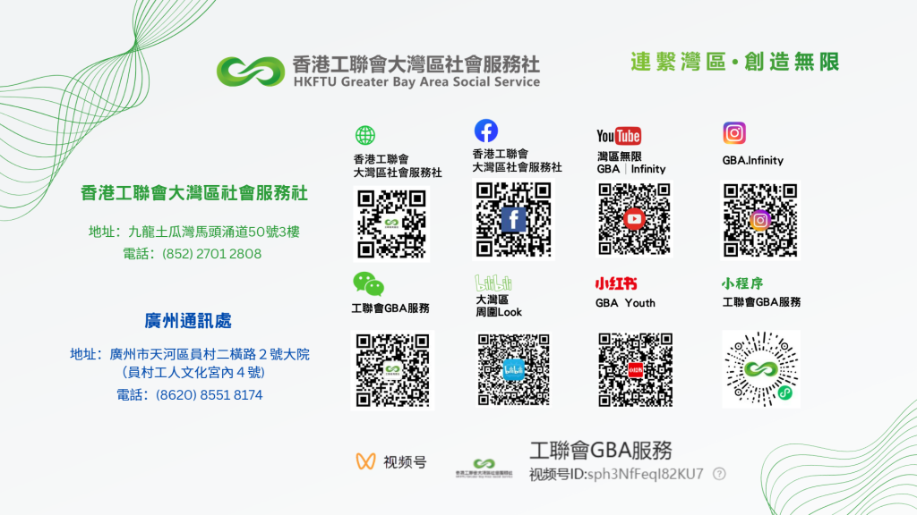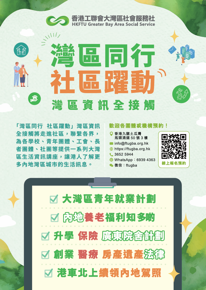 「灣區同行 社區躍動」灣區資訊全接觸是一系列大灣區生活資訊講座,由灣區社主辦,為各學校、青年團體、工會、長者團體、社團等提供灣區資訊,讓港人了解更多内地灣區城市的生活訊息。歡迎各團體或機構致電 3652 5944 預約講座。