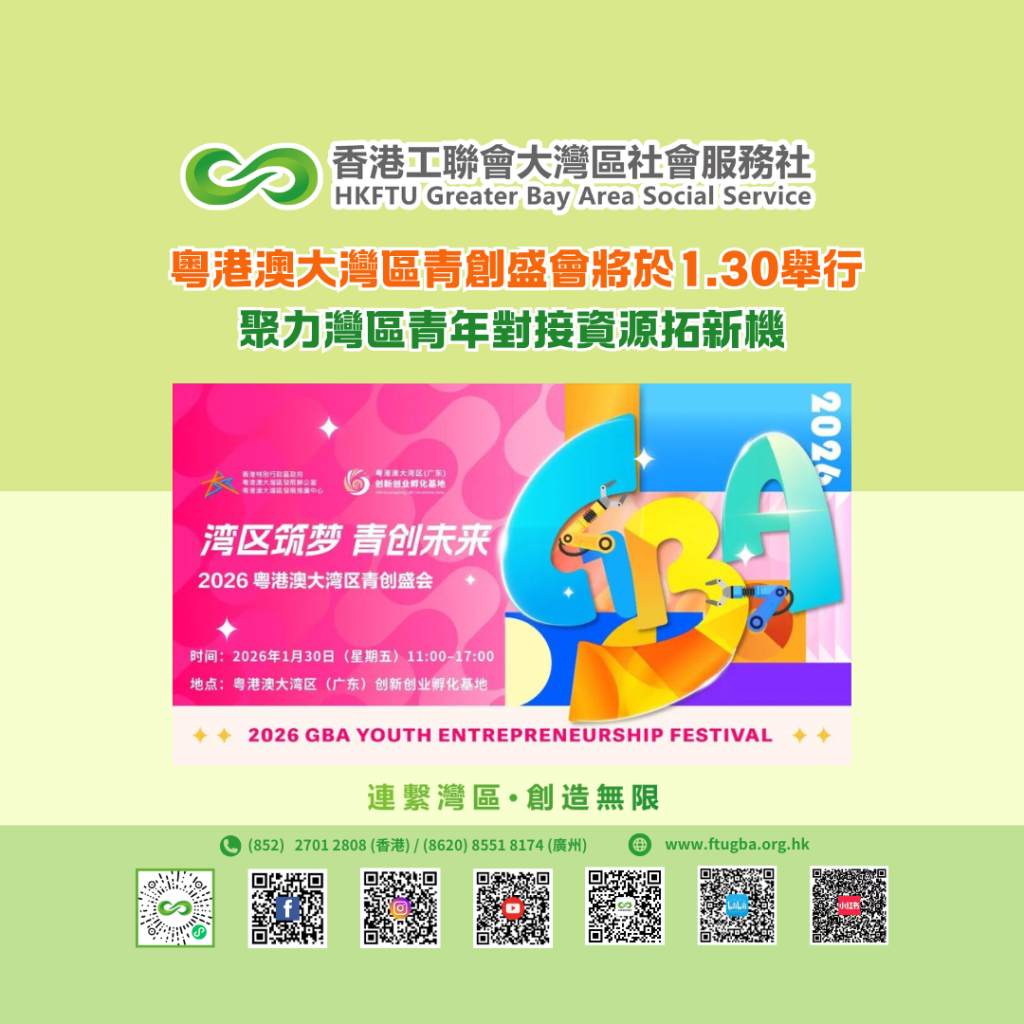 為進一步推動粵港澳大灣區青年創新創業生態融合,由香港特別行政區政府粵港澳大灣區發展推廣中心與粵港澳大灣區(廣東)創新創業孵化基地共同主辦的「灣區築夢・青創未來」2026粵港澳大灣區青創盛會,將於1月30日在廣州舉行。