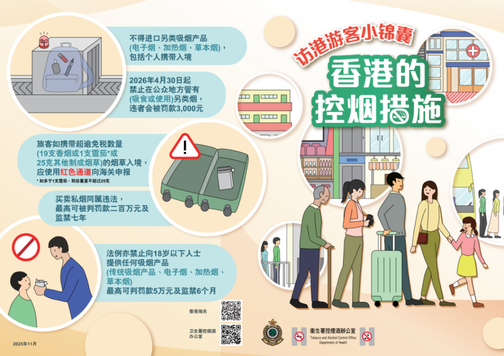 衞生署提醒市民,《2025年控煙法例(修訂)條例》(《修訂條例》)中針對吸煙罪行的其中三項修訂將於2026年1月1日生效。