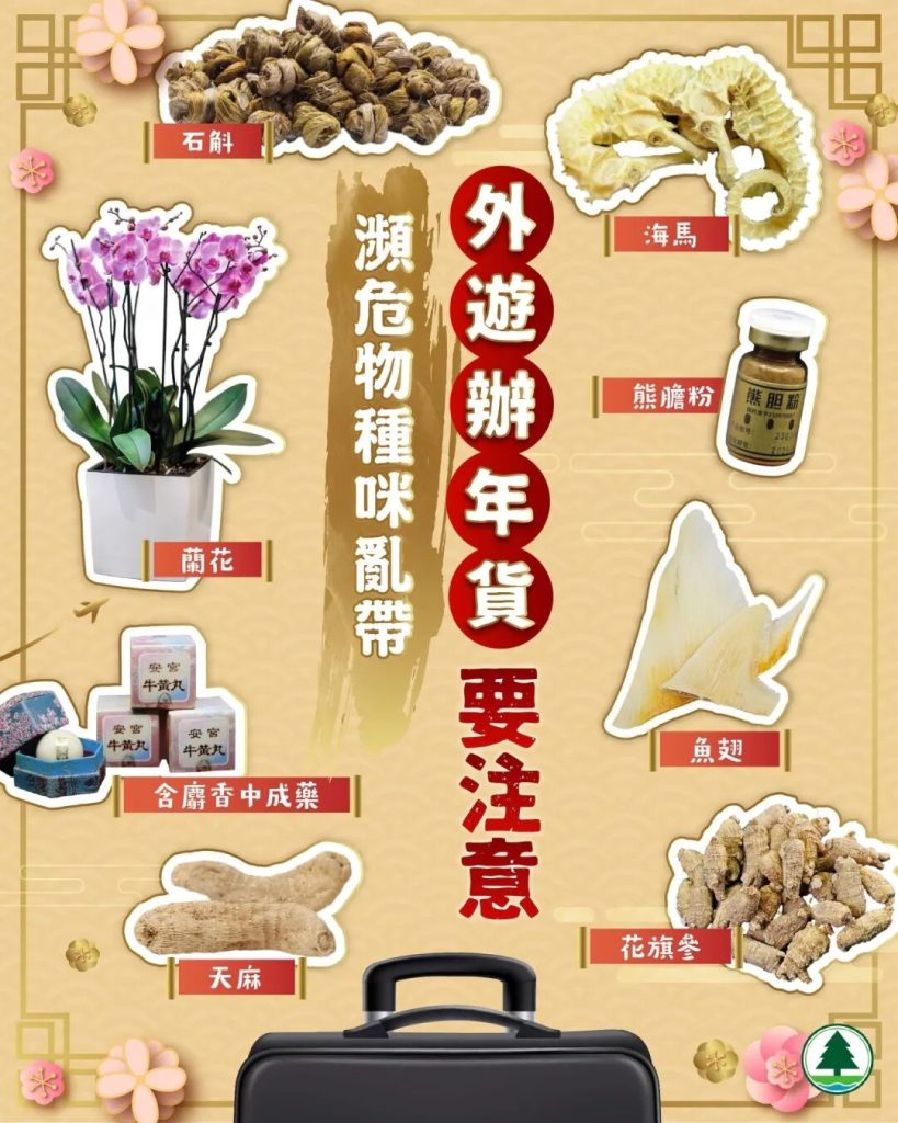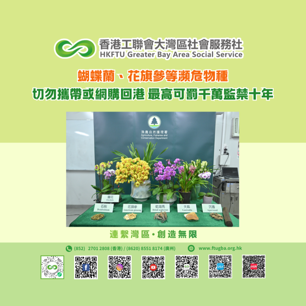 漁護署2月9日提醒市民,切勿攜帶或網購未領有所須許可證的瀕危動植物入境香港,包括蘭花(如蝴蝶蘭等人工栽培品種)、花旗參等。一經定罪,最高可被判罰款1000萬元及監禁10年,有關物品亦會被沒收。漁護署呼籲市民切勿以身試法,漁護署檢疫偵緝犬隊會在陸路邊境管制站、機場等地執勤,打擊走私活動。