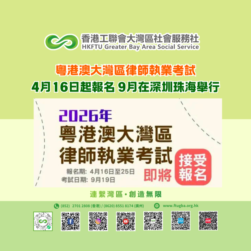 司法部公告2026年粵港澳大灣區律師執業考試(大灣區考試)詳情。考試訂於9月19日在廣東省深圳市、珠海市舉行。符合條件者可於4月16日至25日登錄司法部網站報名參加考試。