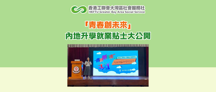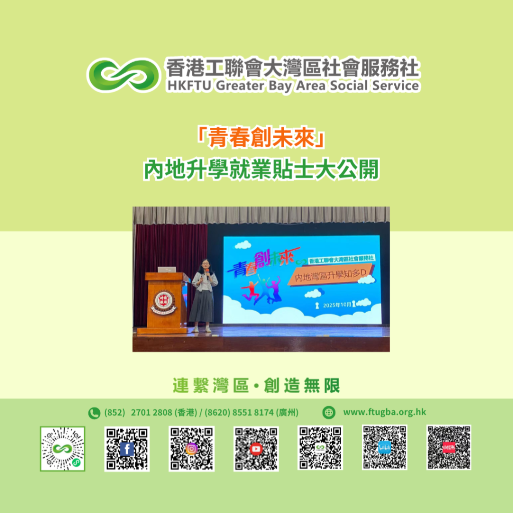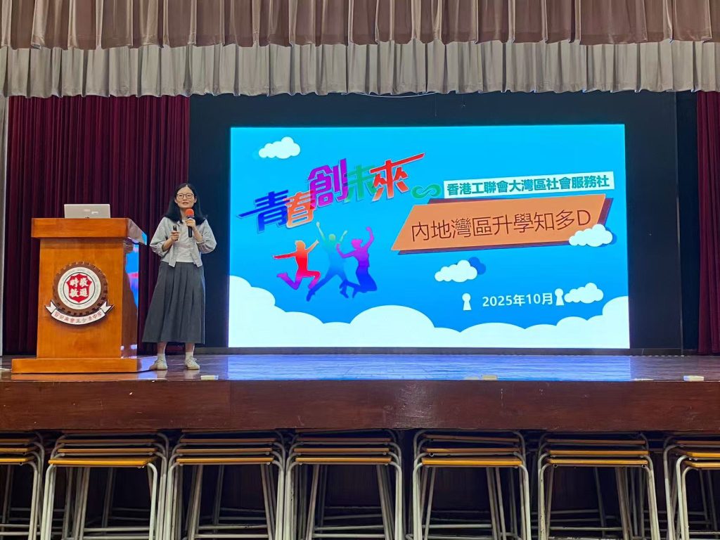 香港工聯會大灣區社會服務社(下稱灣區社)於10月18日應邀來到荃灣寶安商會王少清中學為該校中三至中六近60名學生及家長舉行內地升學講座。講座內容包括灣區內地城市升學渠道、灣區內地城市就業選擇及創業機遇。