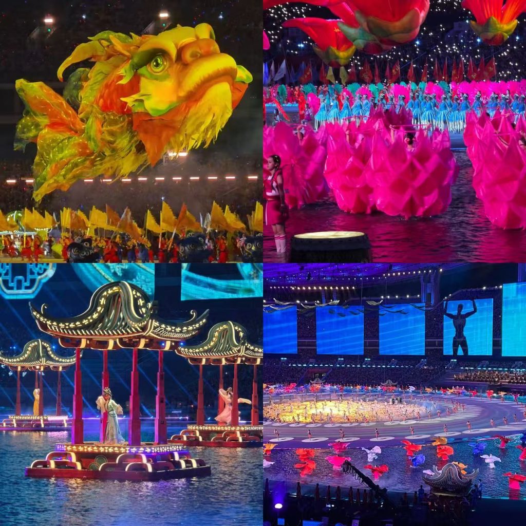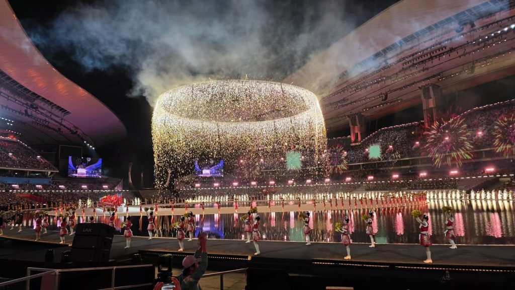 開幕式以「同根同源」、「同心同緣」、「同夢同圓」三大篇章貫穿始終。首章以海上絲綢之路為脈絡,展現嶺南地區的歷史底蘊;第二章將武術、粵劇、南獅、英歌舞等非遺文化與現代藝術完美融合;第三章以木棉盛開為意象,譜寫灣區發展新篇章。