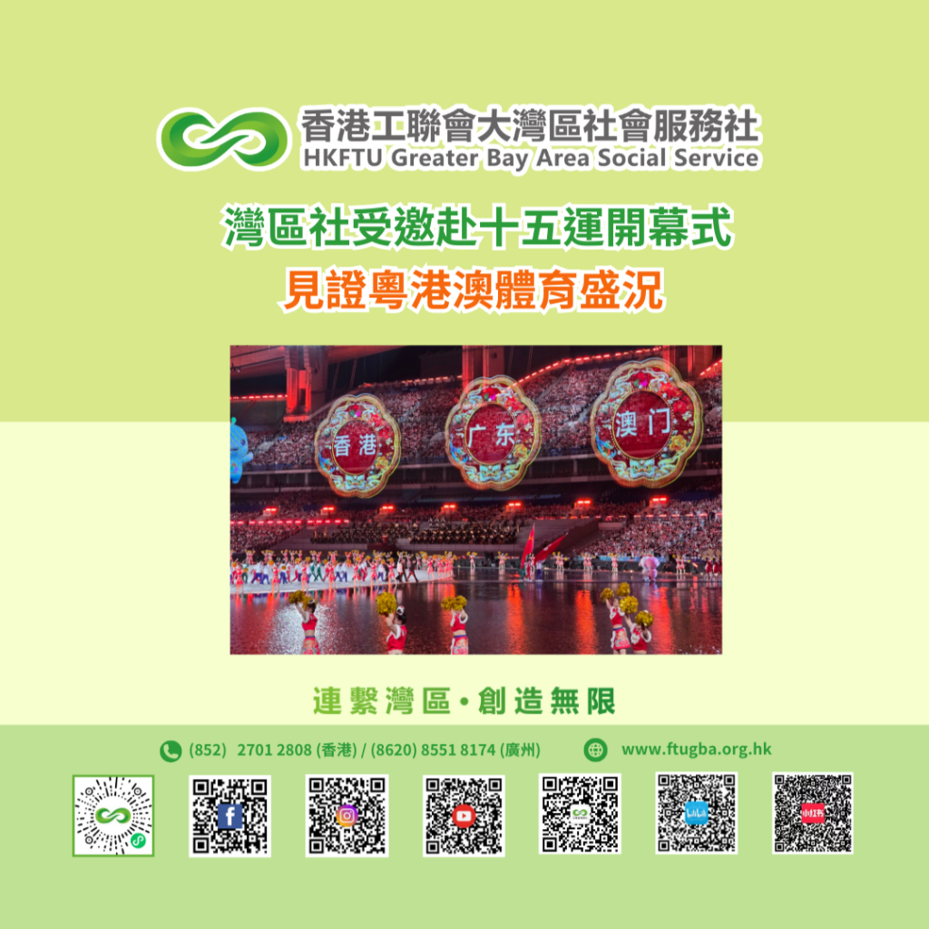 2025年11月9日,香港工聯會大灣區社會服務社(下稱灣區社)應廣州市總工會邀請,前往廣東奧林匹克體育中心參與第十五屆全國運動會開幕式,與三地同胞共同見證這場體育盛事。