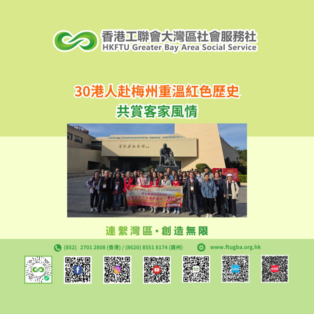 2025年11月,香港工聯會大灣區社會服務社(下稱灣區社)組織30位香港市民前往梅州,參加「千人匯灣區-梅州三天團」,重溫紅色歷史,共賞客家風情。本次活動由廣東省總工會、香港工會聯合會主辦、並獲得灣區社支持。