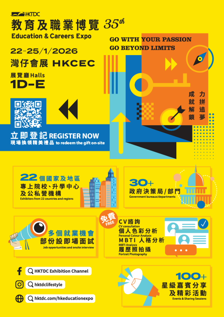第三十五屆「教育及職業博覽」將於2026年1月22日至25日在灣仔香港會議展覽中心舉行。博覽匯聚來自22個國家及地區的專上院校、升學中心及公私營機構,並有超過30個政府決策局及部門參與,為學生、畢業生及在職人士提供一站式升學、進修與職業發展資訊平台,助力青年實踐志向、突破界限。