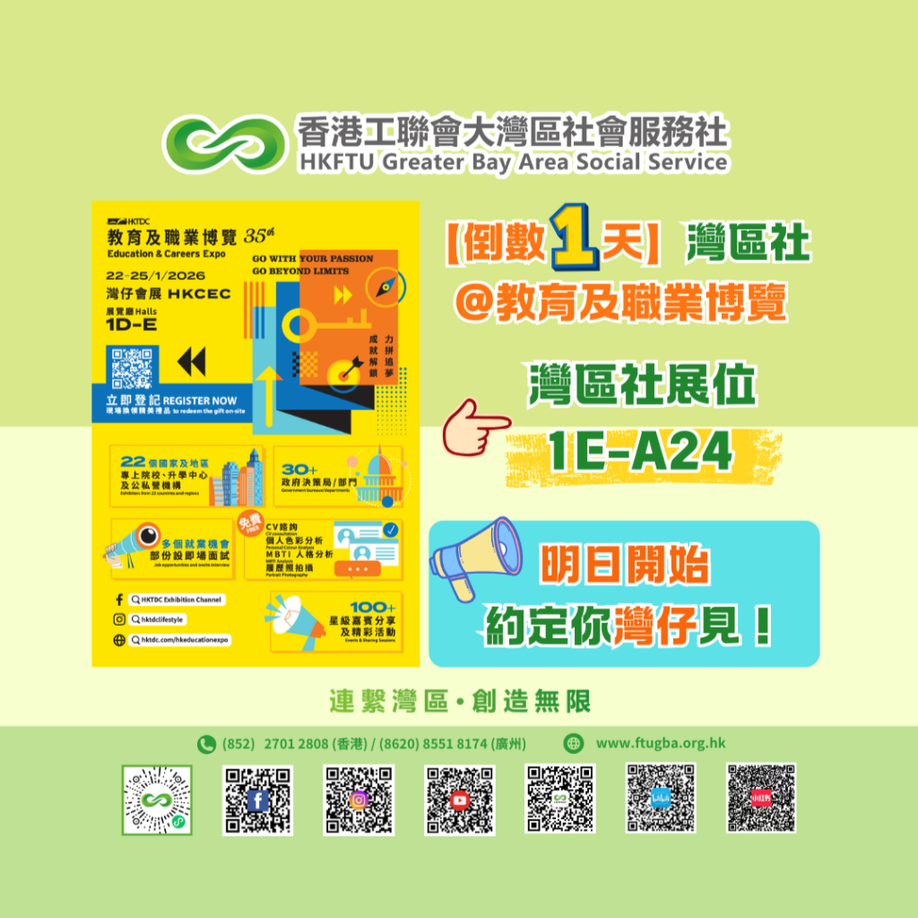 由香港貿發局主辦的第35屆「教育及職業博覽」將於明天起一連四日,在香港會議展覽中心舉行。灣區社已經準備好!歡迎大家來到👉1E-A24展位了解大灣區資訊,更有有趣的互動遊戲及小禮品等你拎!😍