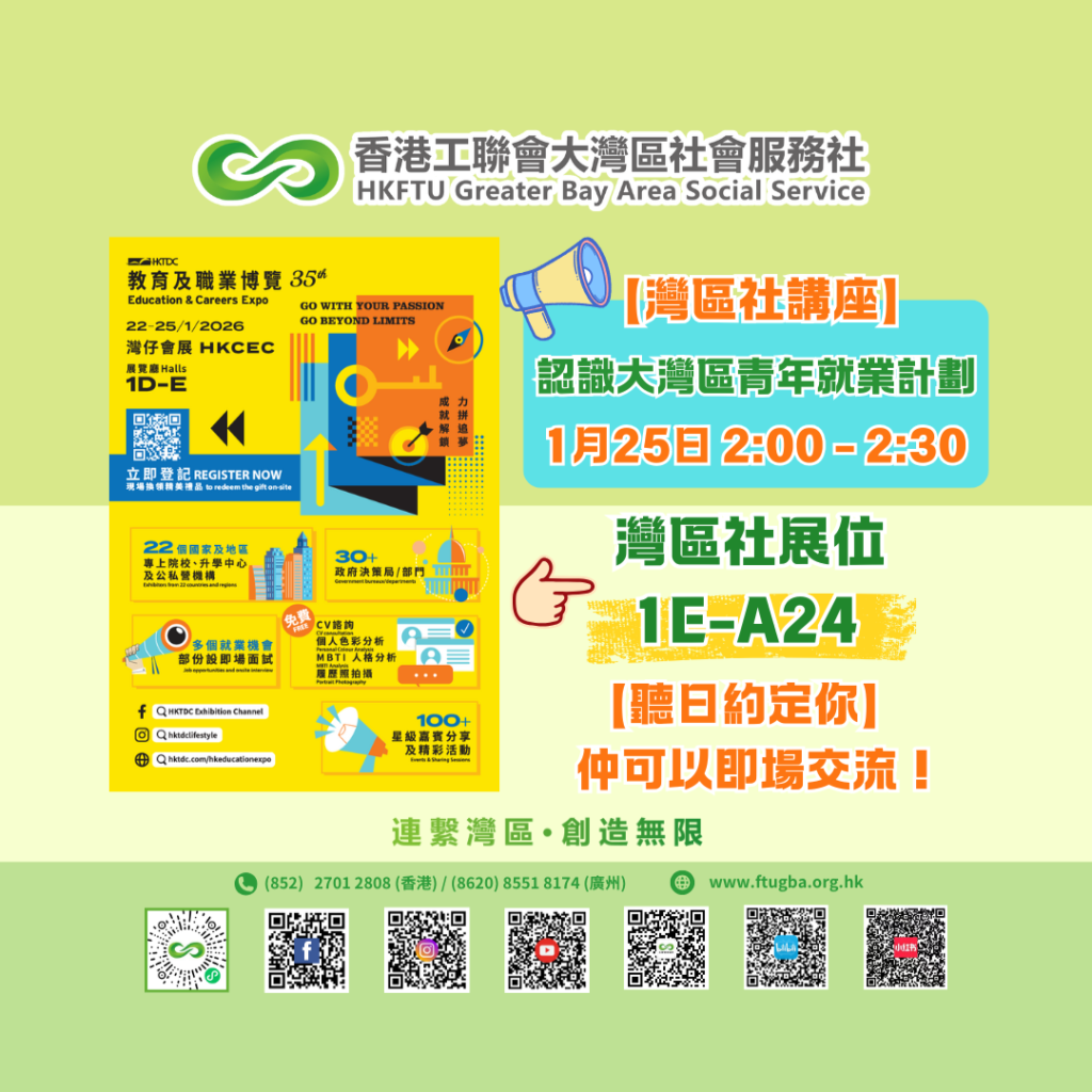 2026年大灣區青年就業計劃已經公布。最新一期計劃會有甚麼變化?如何參與計劃?灣區社會於1月25日在「教育及職業博覽會」職業廣場1D詳細介紹最新計劃安排及支援服務,並分享實用內地就業TIPS!