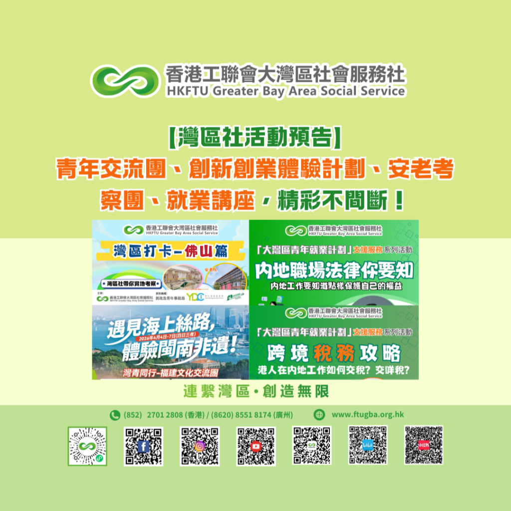 想知活動最新詳情?記住密切留意【香港工聯會大灣區社會服務社】嘅官方公布啦!