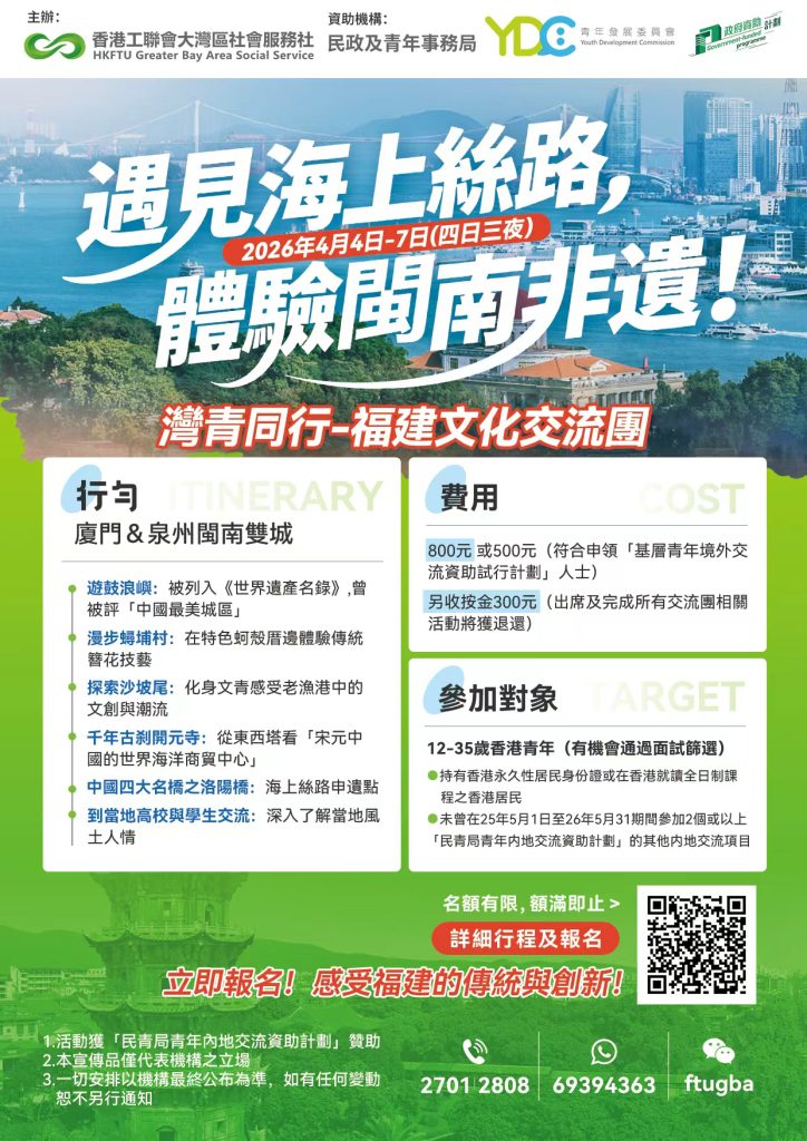 香港工聯會大灣區社會服務社(灣區社)一直致力於支援港人探索大灣區內地城市的就學、就業與生活機遇。2026年,灣區社嘅豐富行程已備好,涵蓋文化交流、創業體驗、安老考察、內地就業幾大主題,等你一齊嚟體驗!