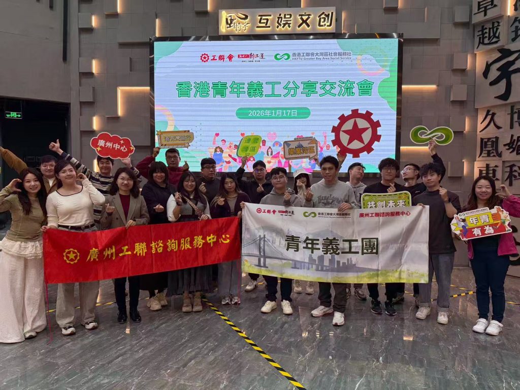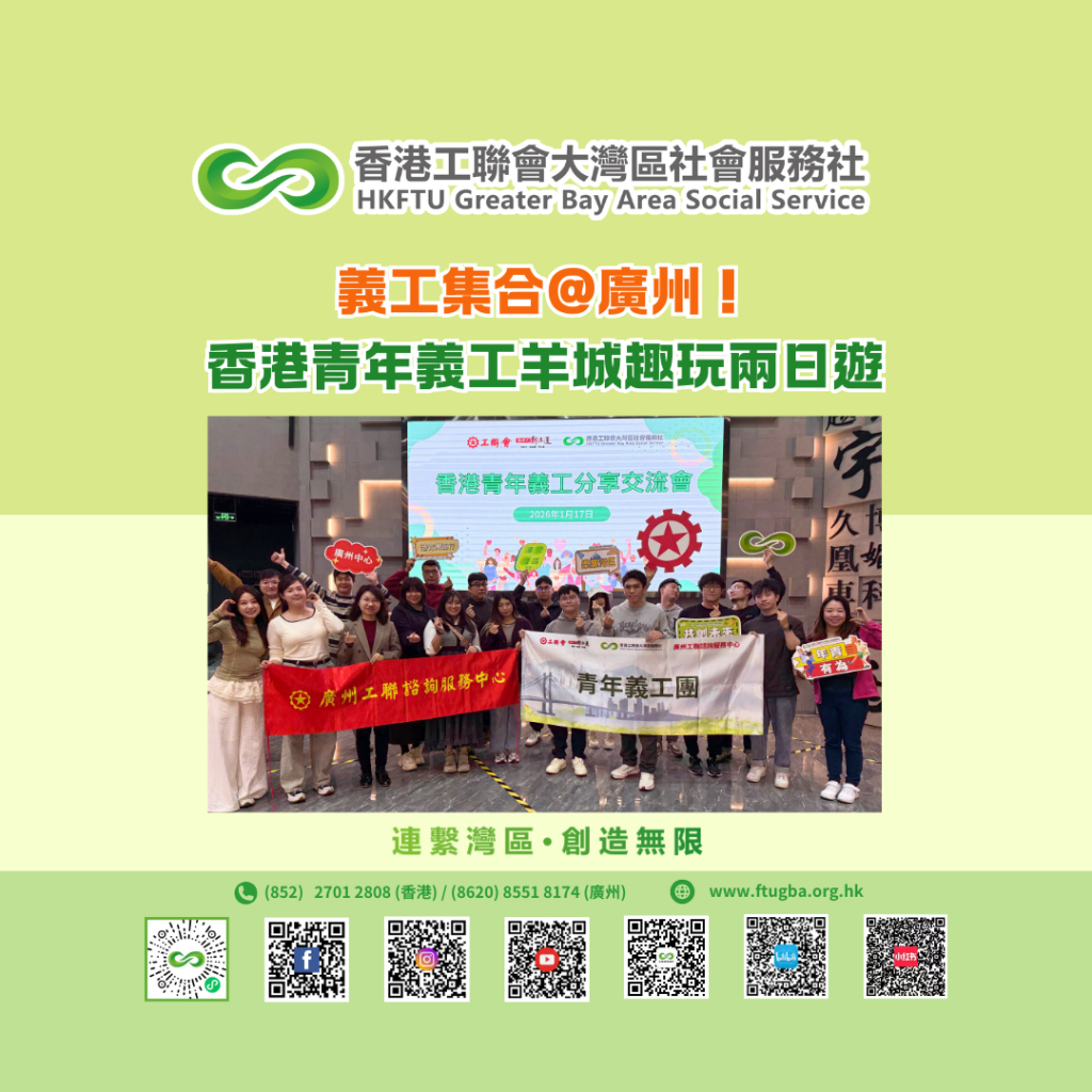 2026年1月17日至18日,由香港工會聯合會、廣州市總工會主辦,廣州工聯諮詢服務中心(下稱廣州中心)承辦,香港工聯會大灣區社會服務社(下稱灣區社)支持的「香港青年義工羊城趣玩兩日遊」活動順利開展!約20名香港青年義工齊聚廣州,在總結義工服務經驗、共話灣區融合的同時,深度感受羊城的城市魅力與發展動能,度過一個充實而有意義的周末。