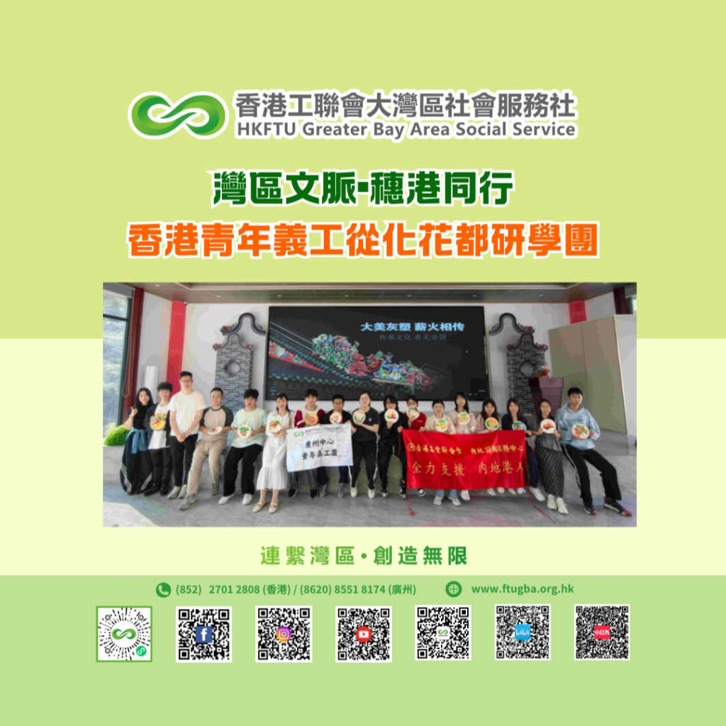「灣區文脈•穗港同行——香港青年義工從化花都研學團」活動於2026年3月14至15日成功舉辦。該活動由香港工聯會與廣州市總工會聯合主辦,香港工聯會大灣區社會服務社協辦,廣州工聯諮詢服務中心承辦。活動組織20名香港青年走進廣州從化與花都兩區,通過實地參訪與深度體驗,厚植家國情懷,感受灣區發展活力。