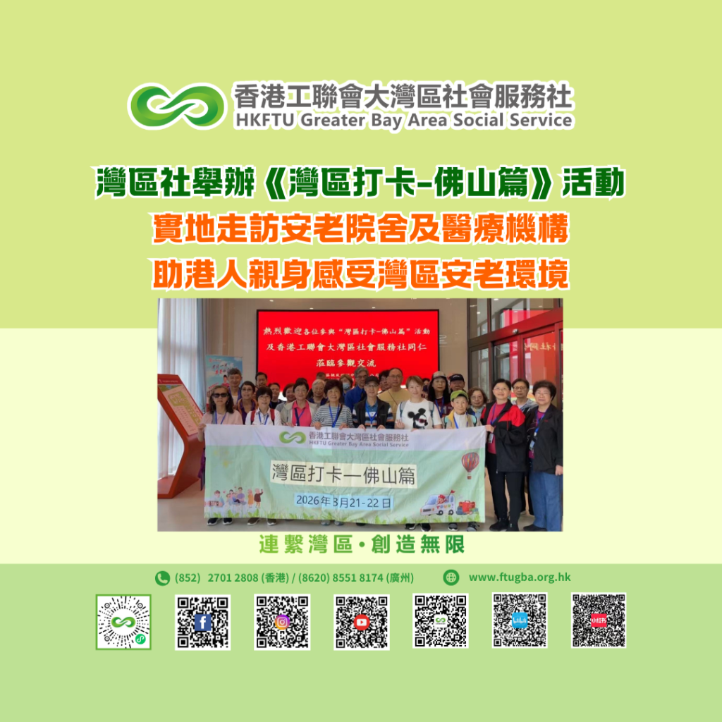 3月21日至22日,香港工聯會大灣區社會服務社(下稱灣區社)舉辦《灣區打卡—佛山篇》考察活動,吸引近40位參加者一同深入佛山,實地了解當地的安老及醫療服務,反應熱烈。