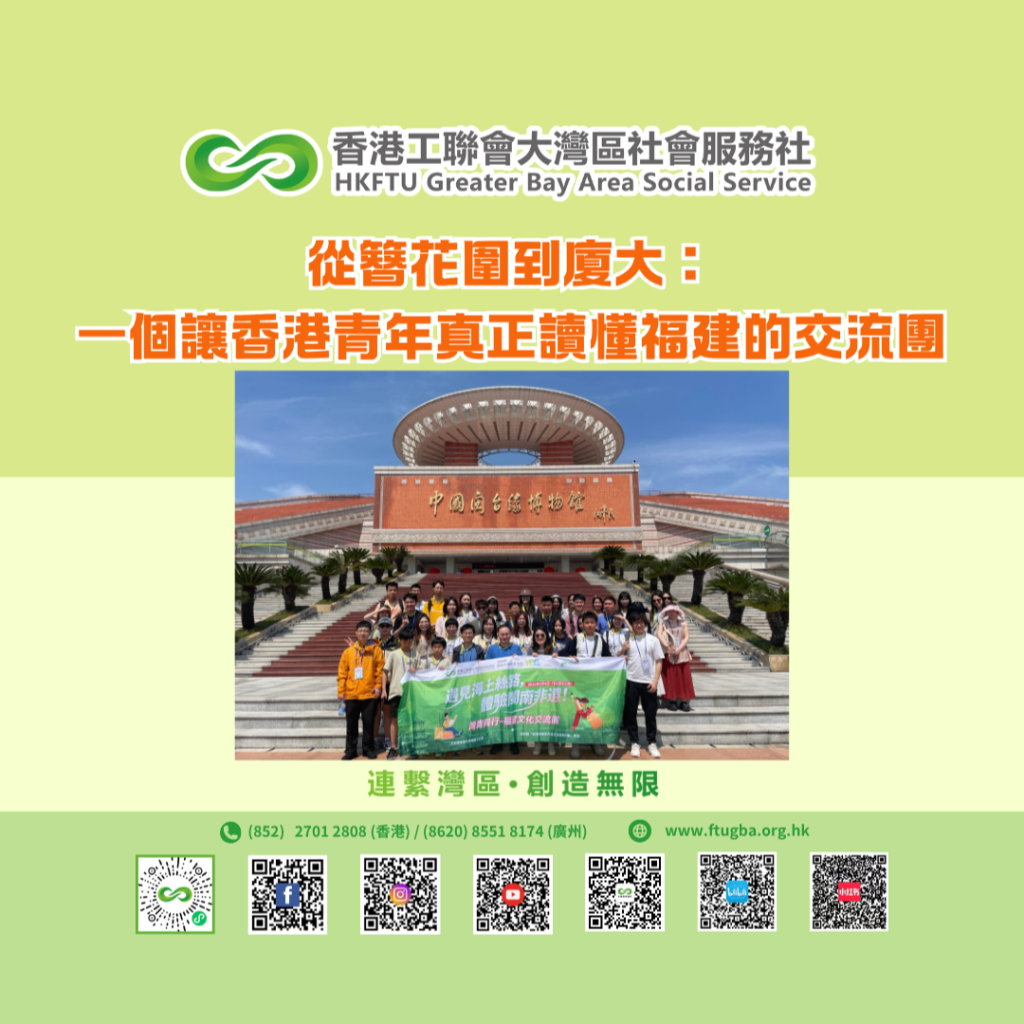 「灣青同行-福建文化交流團」、「灣青同行-廣佛非遺city walk交流團」由香港工聯會大灣區社會服務社主辦,由香港特區政府民政及青年事務局和青年發展委員會之「民青局內地交流資助計劃」撥款資助。
