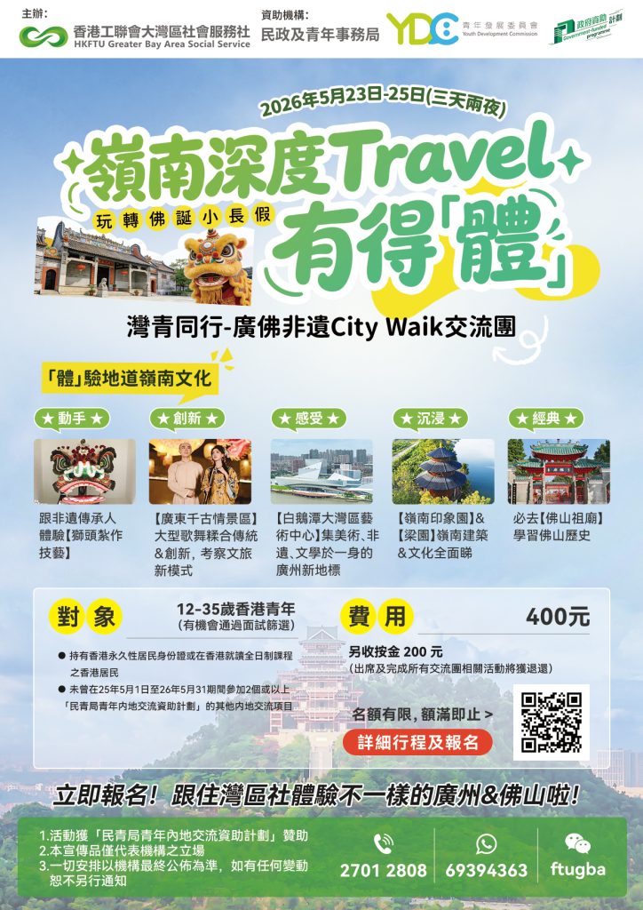 繼福建之旅後,下一站2026年5月23至25日(三日兩夜)「灣青同行-廣佛非遺city walk交流團」開啟招募!