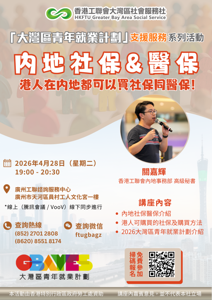 4月28日晚,香港工聯會內地事務部高級秘書關嘉輝先生,將會同大家分享內地社保醫保指南,你將了解到: