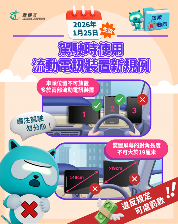 司機專注駕駛對道路安全至關重要。在平衡運輸業界的需要及科技發展等考慮,由2026年1月25日起,任何司機駕駛時不可在前方放置多於兩部流動電訊裝置,即流動電話、平板或手提電腦,而有關裝置的屏幕對角長度不可超過19厘米。流動電訊裝置不能阻礙司機目視道路及交通情況,以及對觀察路況用的鏡、裝置或攝像顯示器的視線。發言人表示,違反上述規定的司機最高可判處罰款2,000元。