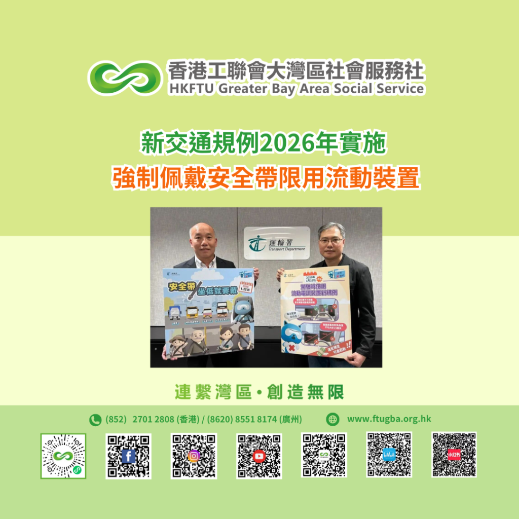 由2026年1月25日起,所有公共交通工具和商用車的座位乘客均須佩戴安全帶。同日起,任何司機在駕駛時均不可使用多於兩部流動電訊裝置。兩項新規定旨在進一步加強道路、乘車和駕駛安全。