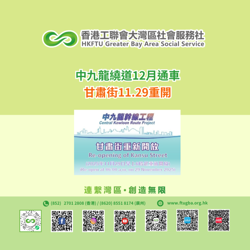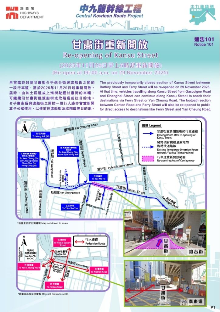 中九龍繞道(油麻地段)的建造已進入最後衝刺階段,將於今年12月開通。早前為配合興建中九龍繞道(油麻地段)而臨時封閉介乎炮台街與渡船街之間的一段甘肅街,將於11月29日(星期六)上午6時重新開放,並將實施交通及運輸安排。