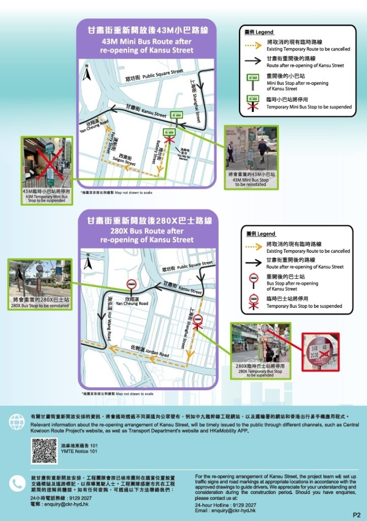 由加士居道或上海街駛經甘肅街的車輛,可繼續沿甘肅街經渡船街或欣翔道前往目的地;甘肅街介乎廣東道與渡船街之間的一段行人路會重新開放;部分九巴第280X號線的巴士站,以及九龍專線小巴第43M號線的小巴站亦會重置。相關營辦商會張貼告示,通知乘客相關安排。
