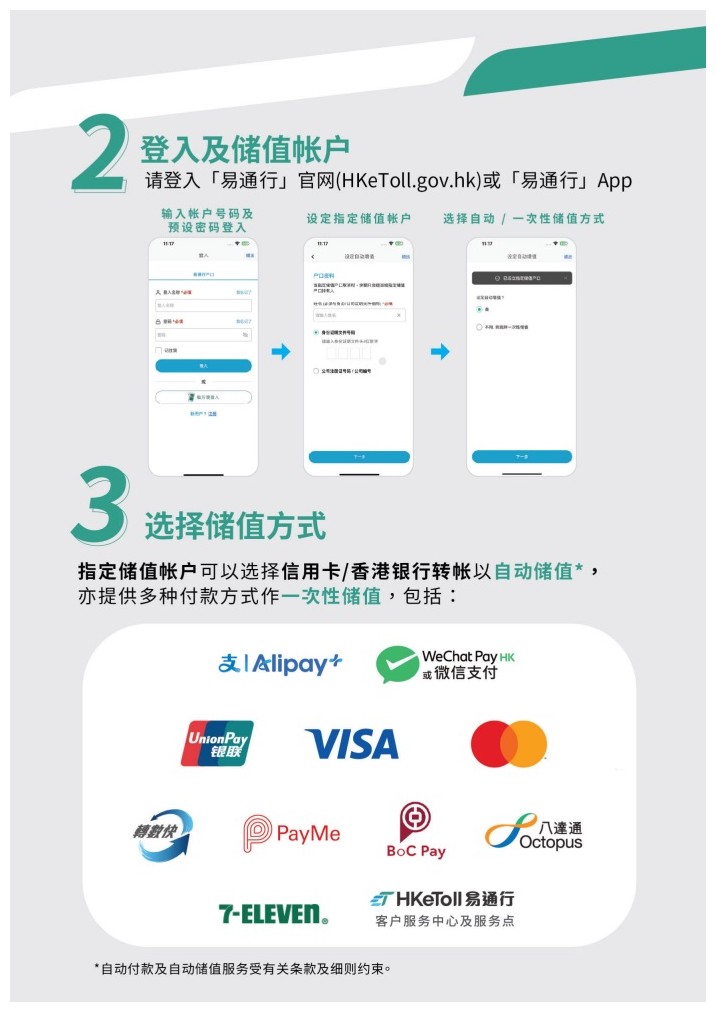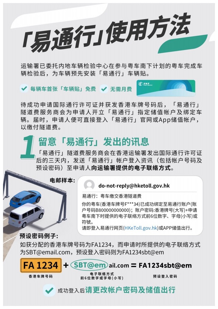 (1) 留意信息:在獲發香港車牌號碼後,會透過提供的電郵/手機號碼(電子聯絡方式)發送「易通行」帳戶的登入資訊,包括帳戶號碼及預設密碼。