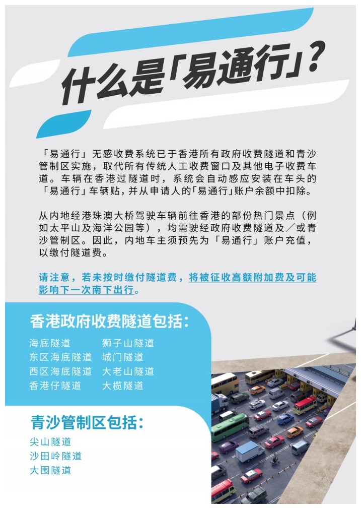香港特區政府運輸署11月20日發布「易通行」主題宣傳單張,幫助市民更加便捷使用「粵車南下」入境香港市區。除了為電子錢包充值以外,記得開通及充值「易通行」指定儲值賬戶,通過隧道更方便。