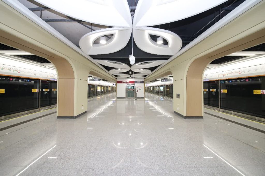 石鼓站毗鄰大疆天空之城、鵬城實驗室等科創地標,以「無人機」為設計靈感,將機翼形態轉化為裝飾單元,立柱如科技之樹向上生長,彰顯灣區科創活力。石岩站緊鄰兩大森林公園,天花模擬自然採光搭配葉脈元素,將山林質感與陽光意象融入空間,讓港人在通勤中感受自然。上屋站採用綠色主題色彩與折線線條,天花方框造型中嵌入深圳特色建築群天際線圖案,象徵地鐵網絡與城市發展的深度融合。
