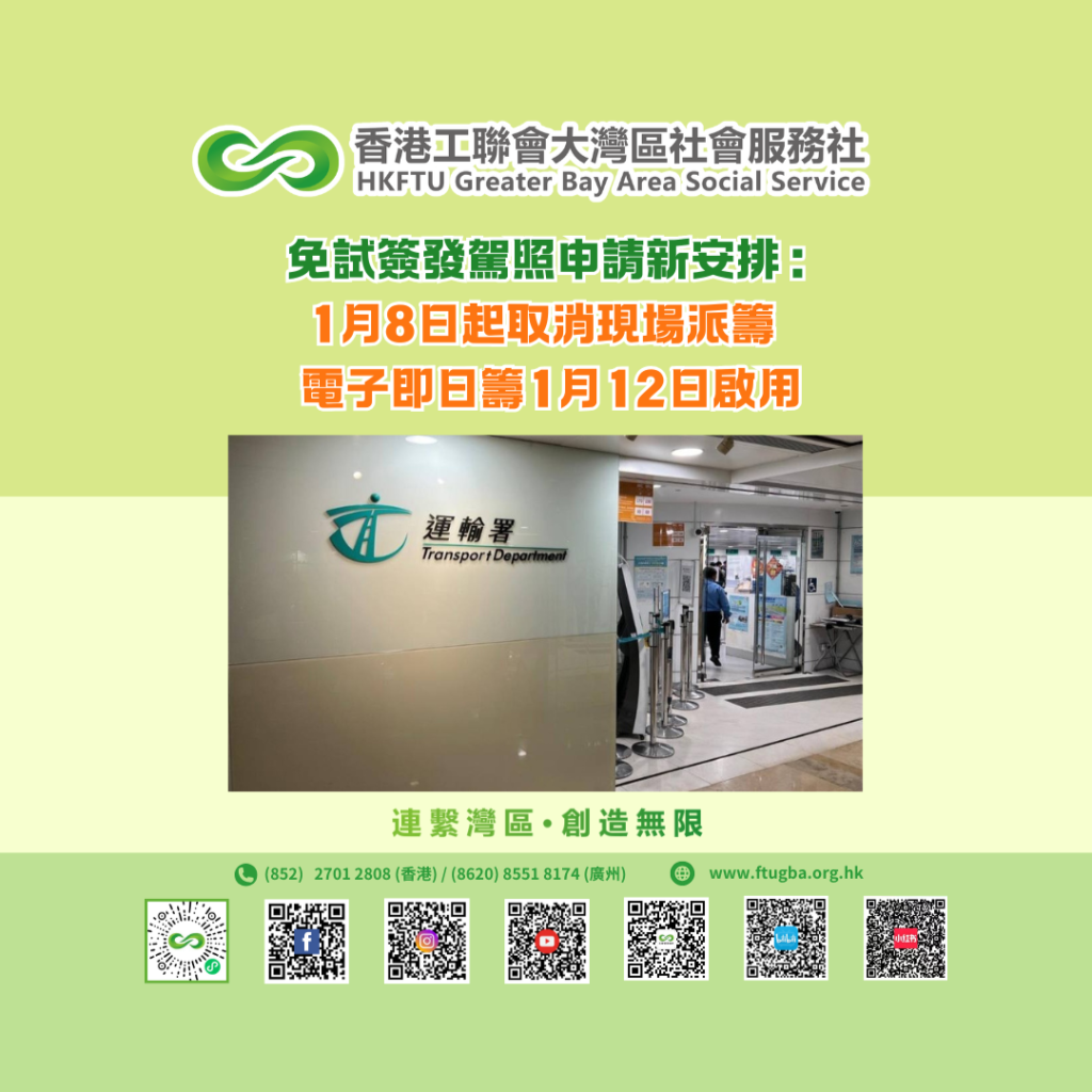 由於有人濫用現場派籌安排,為防止免試簽發的輪候影響其他牌證申請,以及優化牌照事務處的秩序管理,署方將由1月8日開始取消免試簽發現場派籌安排。申請人或其代理人由1月12日起可使用「電子即日籌」服務經網上取籌。此外,現有免試簽發網上預約櫃位服務維持不變,早前經網上預約系統提前預約櫃位服務的申請人可繼續按預約時間前往香港牌照事務處辦理免試簽發申請。