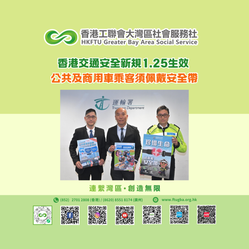 政府提醒市民,由1月25日起,所有公共交通工具和商用車座位乘客均須佩戴安全帶;此外,任何司機在駕駛時均不可在前方放置多於兩部流動電訊裝置,進一步加強道路、乘車和駕駛安全。