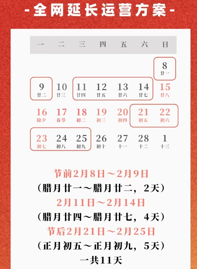 在2月10日(臘月廿三)2月15日至2月20日(臘月廿八至正月初四)共七天,僅4號線延長運營服務時間30分鐘,確保4、5、6號線深圳北站雙方向末班車發車時間均不早於24時。