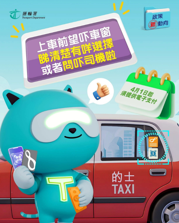 由4月1日起,香港的士司機必須向乘客提供至少兩種電子支付方式,包括二維碼(如支付寶、微信支付、BoC Pay等)和非二維碼(如八達通、信用卡或轉數快等)方便乘客付款。的士業議會3月9日舉辦「的士司機提供電子繳費媒介啟動禮」,香港特區政府運輸署助理署長馮惠筠指,全港三分一的士,包括所有的士車隊已安裝一體式收款機,能支援多種付款方式,業界有信心4月可全面提供電子支付。