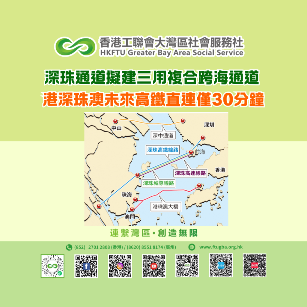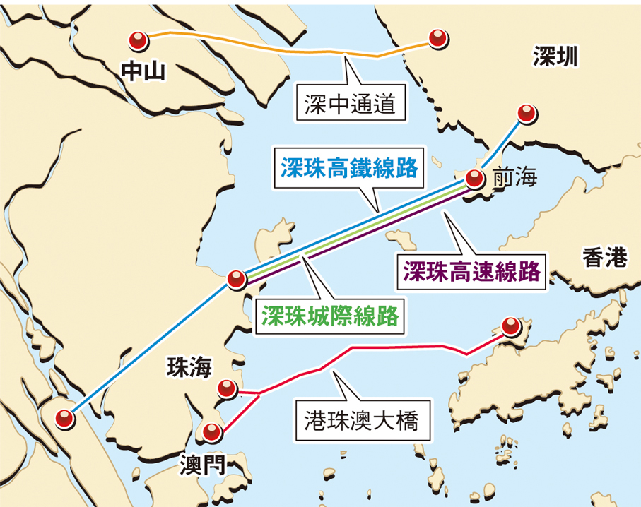 根據初期規劃,深珠通道的高鐵、城際線路可望在深圳側分別銜接廣深港高鐵及規劃中的港深西部鐵路,屆時港人前往珠江西岸將增添更加便捷的全新通道,灣區「一小時乃至半小時生活圈」將進一步完善。