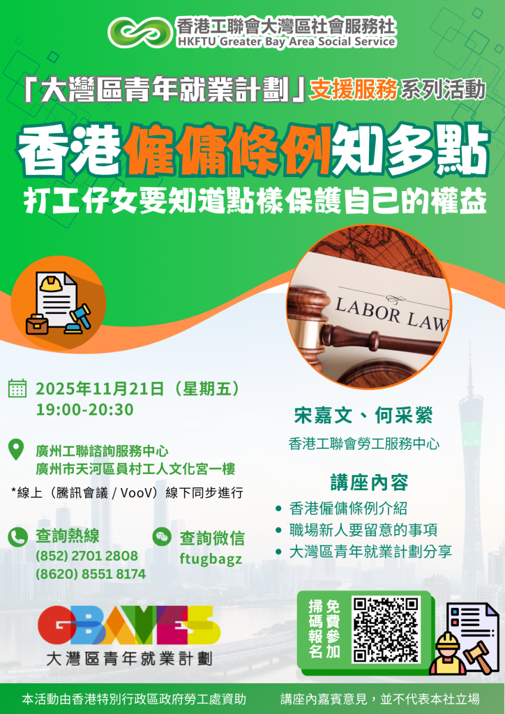 11月21日晚,工聯會灣區社特邀請香港工聯會勞工服務中心同事,為大家解讀香港僱傭條例,並分享職場新人需留意的事項!