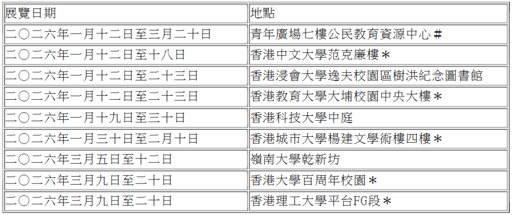 巡迴展覽得到八所大專院校和青年廣場公民教育資源中心提供場地支持,展覽詳情如下: