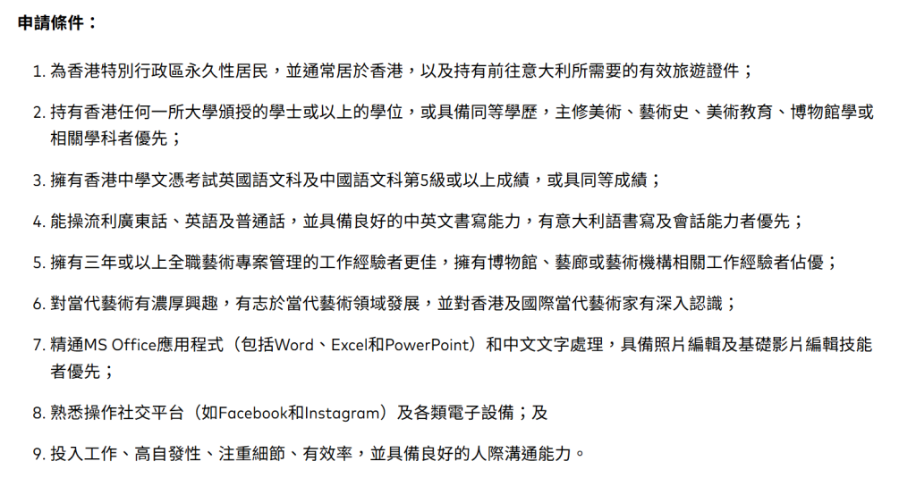 香港藝術館將首度與香港藝術發展局合作,參與今年5月至11月在意大利威尼斯舉行的第61屆威尼斯視藝雙年展外圍展,攜手將香港藝術家伍韶勁和許開嬌的作品帶到大型國際展覽。現招募實習生於展覽期間駐留威尼斯,深入了解展覽運作流程,累積寶貴實戰經驗,拓寬文化與國際視野,歡迎有志於當代藝術領域發展的人士申請。截止日期為1月30日。