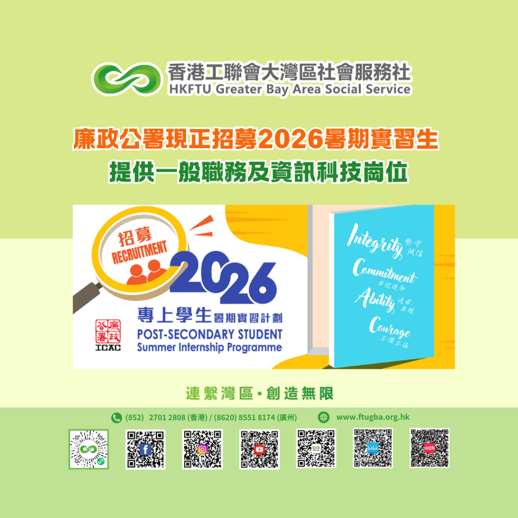 廉政公署2026年專上學生暑期實習計劃已推出。這計劃提供實習機會予正於本地或中華人民共和國香港特別行政區以外的專上院校就讀全日制課程,並為香港特別行政區永久性居民的學生。