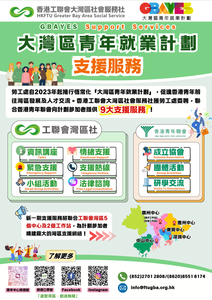 灣區社會持續升級各項支援服務,並將聯同工聯會在灣區的五間中心和兩個工作站,構建龐大灣區網絡,讓各地的參加者都能得到充分支援!