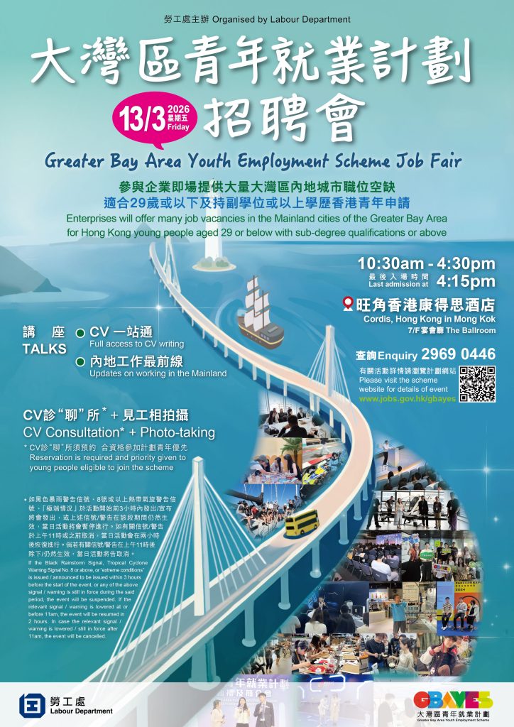 參加機構將提供大量派駐大灣區內地城市工作,並按照香港法例聘用的職位空缺,29歲或以下及持副學位或以上學歷香港青年可申請。