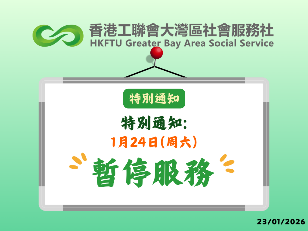 香港工聯會大灣區社會服務社於2026年1月24日(周六)暫停服務,特此公告。不便之處,敬請諒解!