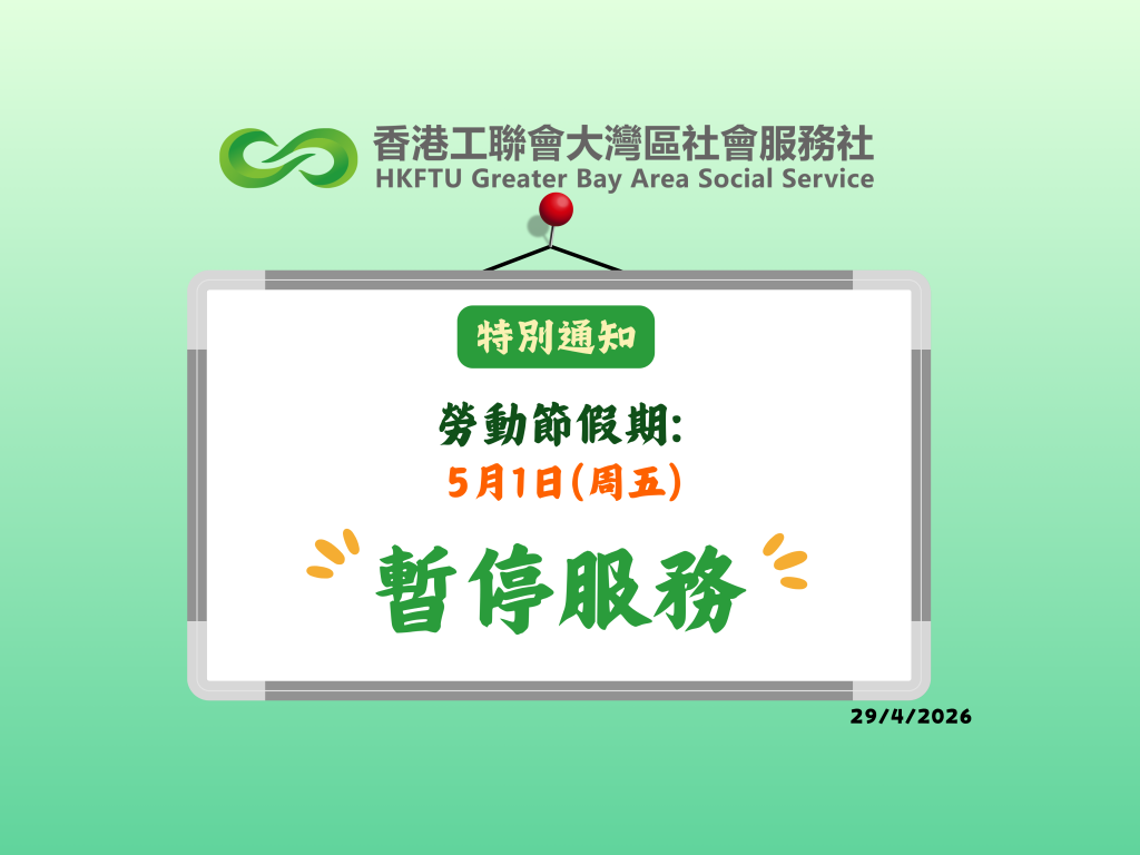 香港工聯會大灣區社會服務社將於2026年5月1日(周五)暫停服務,特此公告。不便之處,敬請諒解!
