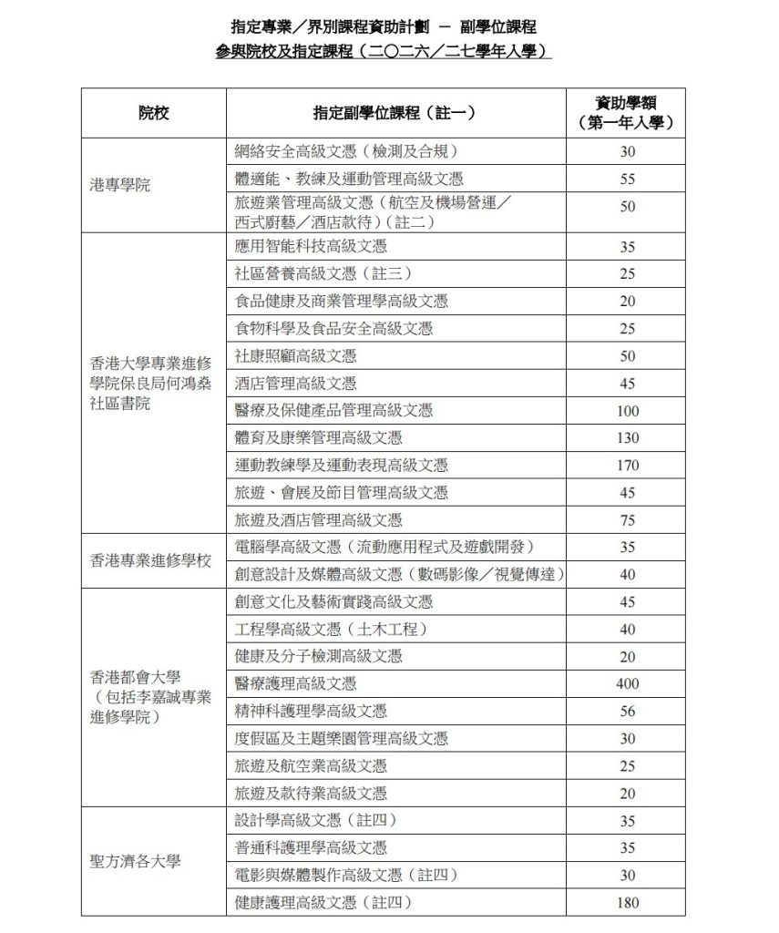 教育局11月20日公布,指定專業/界別課程資助計劃在2026/27學年將資助六所專上院校共32個副學位課程的2131個學額。