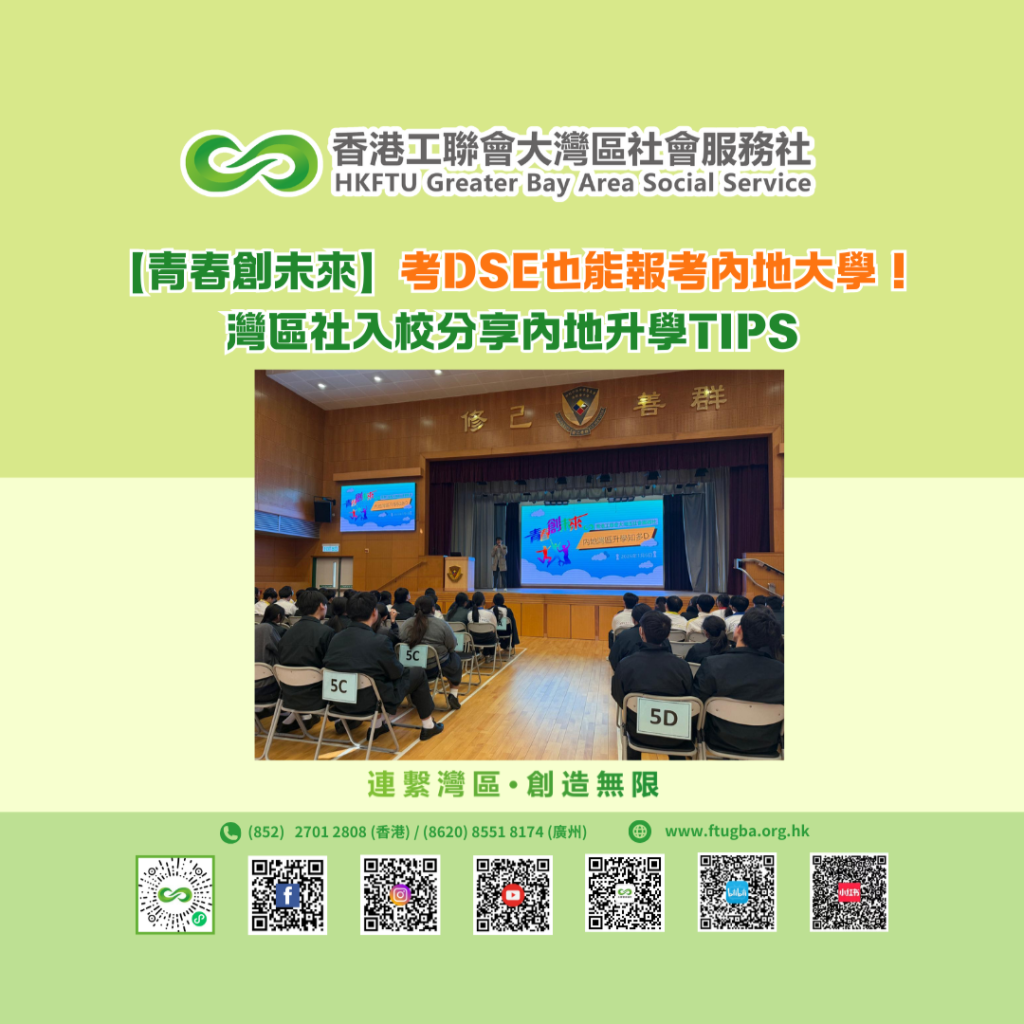 2025年1月6日,香港工聯會大灣區社會服務社(灣區社)應香港文職及專業人員總會邀請,到伊利沙伯中學舊生會湯國華中學,以「內地升學知多D」為題,為約90位中五學生分享內地升學出路及發展機遇。