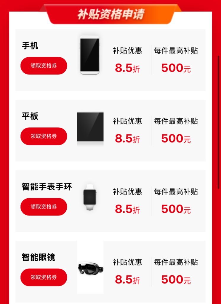 - 數碼產品:包括手機、平板電腦、智能手錶/手環、智能眼鏡及智能家居產品共5類。單件產品售價須在6000元人民幣或以下,補貼比例為售價的15%,上限為500元人民幣。每位消費者每類產品僅限享受一次補貼。