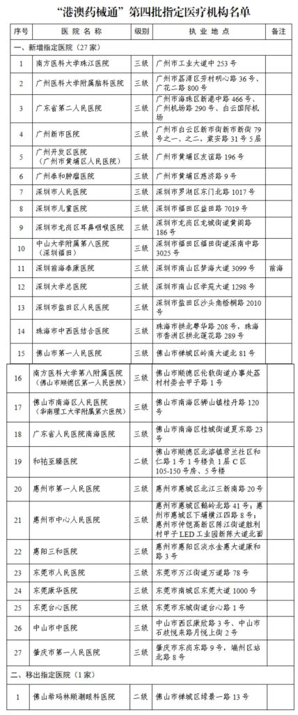 2025年8月,廣東省衞生健康委員會啟動「港澳藥械通」第四批指定醫療機構申報工作,並組織對前三批指定醫療機構資質進行覆核。經大灣區內地市受理評估、廣東省衞生健康委審核,確定新增27家醫院為第四批指定醫院,44家醫院通過資質覆核,1家醫院因停業移出指定醫院名單。