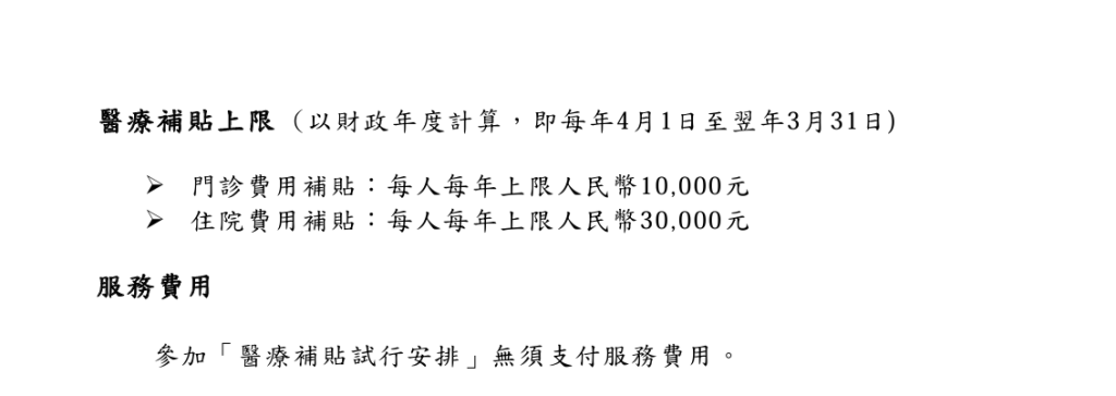 參加廣東院舍照顧服務計劃(計劃)的長者由試行安排推行日起,在國家醫療保障(醫保)政策下,於粵港澳大灣區(大灣區)內任何醫保定點單位(包括診所、醫院和藥房)就診,可就屬於醫保範圍項目而須自付的醫療費用申請補貼。補貼上限為每人每年門診費用人民幣一萬元及住院費用人民幣三萬元。